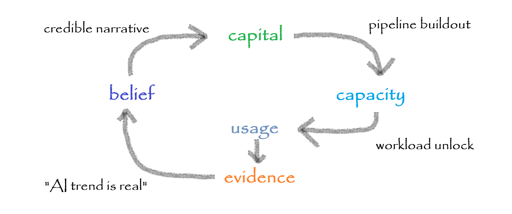 The constraints are on the links connecting capital to capacity and capacity to usage. There are only two possibilities: constraints are manageable or they become binding and expensive. The latter implication: ROI is getting killed, weakening the usage evidence; hence, making the loop unsustainable (reversing it).