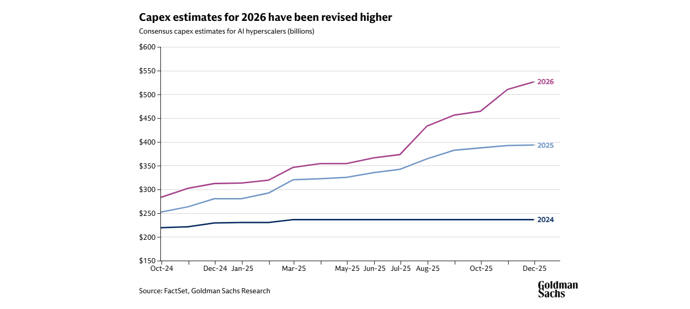 A Goldman Sachs report earnings on Q3 2025 guided another increase in capex projections for the AI hyperscalers. Indicated by a capex spending of $106bn for hyperscaler in Q3 alone, the capex growth baseline is at +75% YoY. Such spending shows that large and mega cap firms are making irreversible commitments.